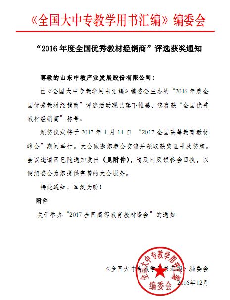 熱烈祝賀山東中教產(chǎn)業(yè)發(fā)展股份有限公司榮獲“2016年度全國優(yōu)秀教材經(jīng)銷商”