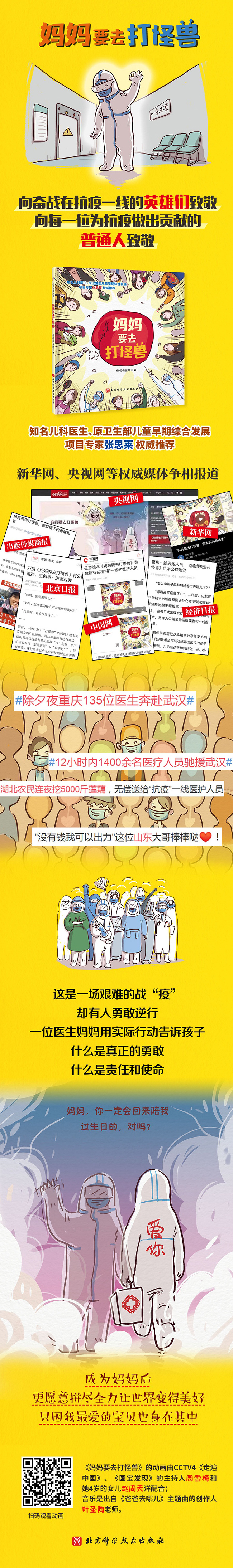 在2020年的除夕,小女孩的媽媽卻不能陪她一起看春晚,因?yàn)閶寢屢ゴ蚬肢F。原來這位媽媽是一位醫(yī)生,她要去打的怪獸就是新型冠狀病毒。這本書以繪本的形式描繪了無(wú)數(shù)平凡人在面對(duì)疫情時(shí)堅(jiān)守自己的崗位,勇敢抗?fàn)幰咔榈墓适隆?/p>