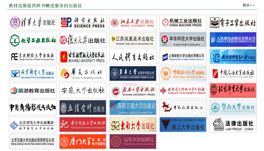 本次活動依托于“教材巡展網(wǎng)上行”(www.jcxzwsx.com)服務(wù)平臺,聯(lián)合清華大學(xué)出版社、北京大學(xué)出版社、科學(xué)出版社、電子工業(yè)出版社、化學(xué)工業(yè)出版社、人民郵電出版社、機械工業(yè)出版社等國內(nèi)162家以教材出版為主的出版社,并得到了學(xué)校教材管理服務(wù)部門的大力支持,打造出一條連接出版社和各學(xué)科任課老師的教材信息交流通道,為各學(xué)科任課老師的教材選用、教材樣書免費申請、自編教材的出版等方面提供優(yōu)質(zhì)的服務(wù)。