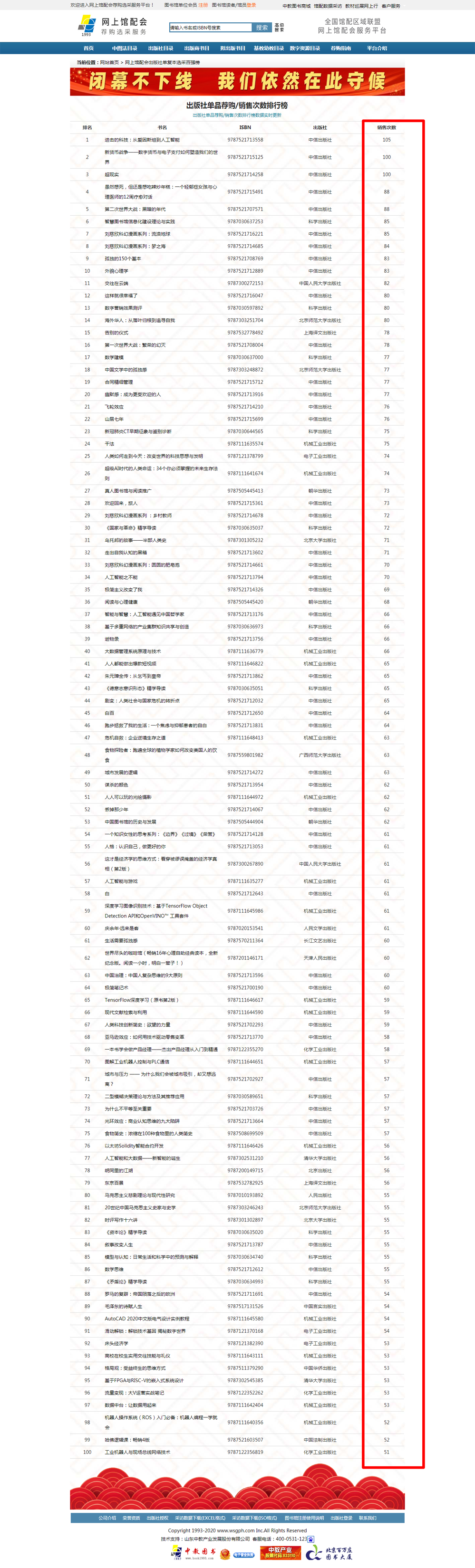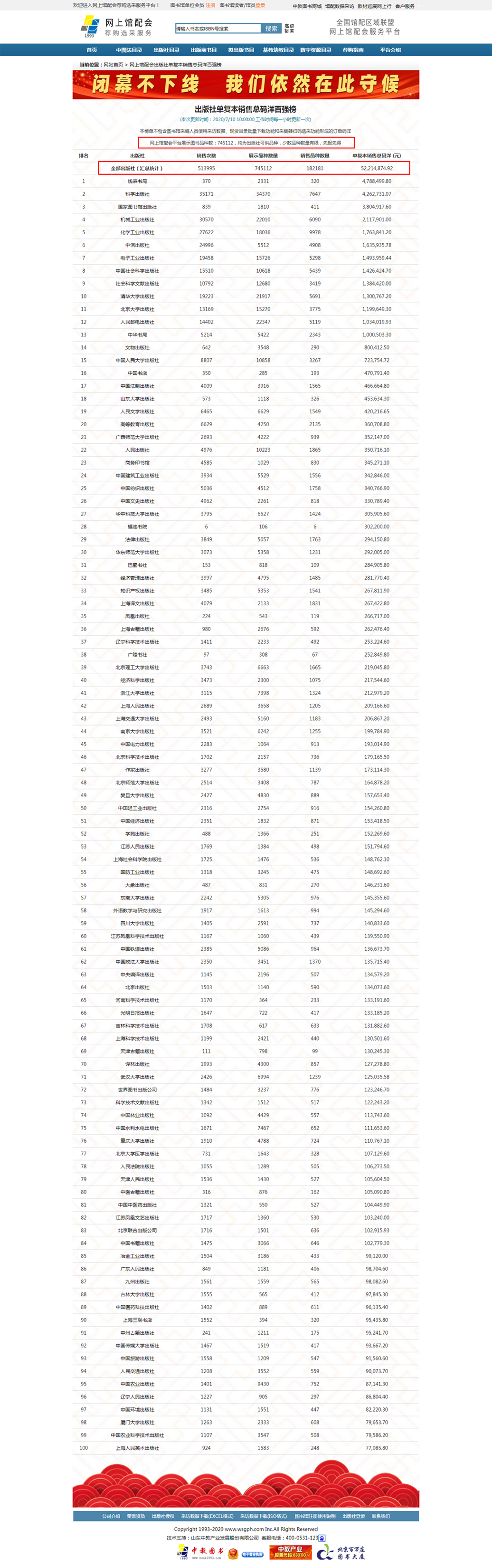 各類數(shù)據(jù)平臺(tái)自動(dòng)統(tǒng)計(jì)列表如下: 出版社單復(fù)本銷售碼洋百?gòu)?qiáng)榜 (特別提示:1.本榜單是將產(chǎn)品按單副本進(jìn)行統(tǒng)計(jì)2.本榜單不包含圖書館采編人員使用采訪數(shù)據(jù)、現(xiàn)貨目錄批量下載功能和采集器掃碼選采功能形成的訂單碼洋;3.網(wǎng)上館配會(huì)平臺(tái)展示圖書品種數(shù)均為出版社可供品種,實(shí)時(shí)動(dòng)態(tài)更新)