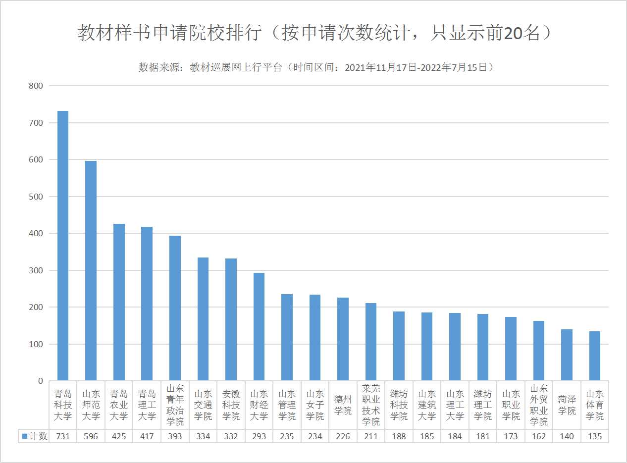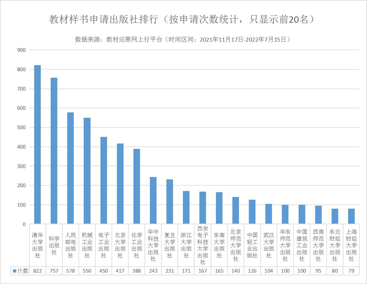 2021年11月17日,“2022全國(guó)教材巡展網(wǎng)上行”正式拉開帷幕。 本次活動(dòng)依托于“教材巡展網(wǎng)上行”(www.jcxzwsx.com)服務(wù)平臺(tái),聯(lián)合科學(xué)出版社、清華大學(xué)出版社、北京大學(xué)出版社、電子工業(yè)出版社、化學(xué)工業(yè)出版社、機(jī)械工業(yè)出版社、人民郵電出版社、人民交通出版社、上海外語(yǔ)教育出版社、外語(yǔ)教學(xué)與研究出版社、北京師范大學(xué)出版社、復(fù)旦大學(xué)出版社、國(guó)防工業(yè)出版社等160多家以教材出版為主的出版社,并得到了學(xué)校教材管理服務(wù)部門的大力支持,打造出一條連接出版社和各學(xué)科任課老師的教材信息交流通道,為各學(xué)科任課老師的教材選用、教材樣書免費(fèi)申請(qǐng)、自編教材的出版等方面提供優(yōu)質(zhì)的服務(wù)。 “2022全國(guó)教材巡展網(wǎng)上行”上線以來(lái),得到了高校教材管理部門及出版社同仁的大力支持及肯定,在此我們深表感謝。為了滿足學(xué)校和出版社的要求,從2021年11月17日開始我們定時(shí)播報(bào)教材巡展網(wǎng)上行的各類數(shù)據(jù)統(tǒng)計(jì),并保證數(shù)據(jù)的真實(shí)性和有效性。 截止到2022年7月15日14時(shí)(統(tǒng)計(jì)區(qū)間:2021年11月17日0時(shí)-2022年7月15日14時(shí))