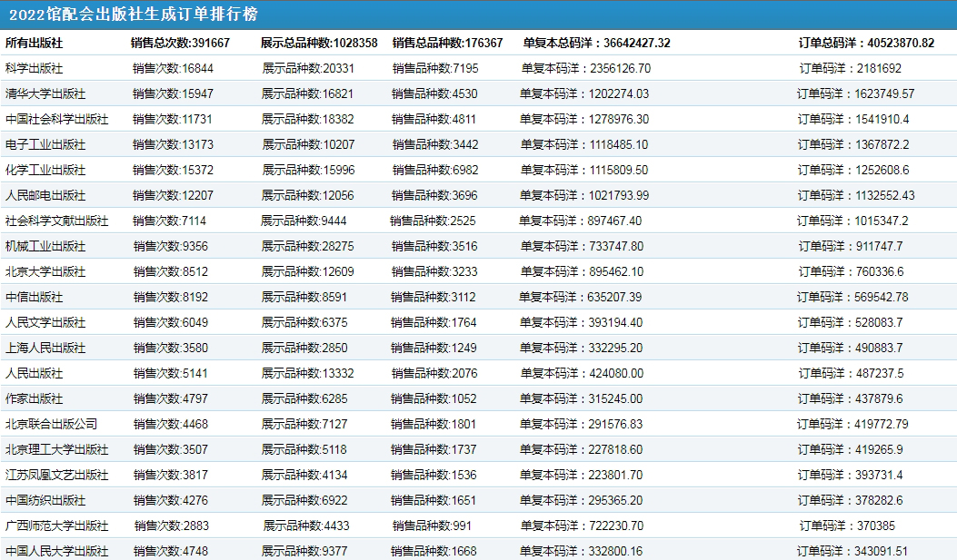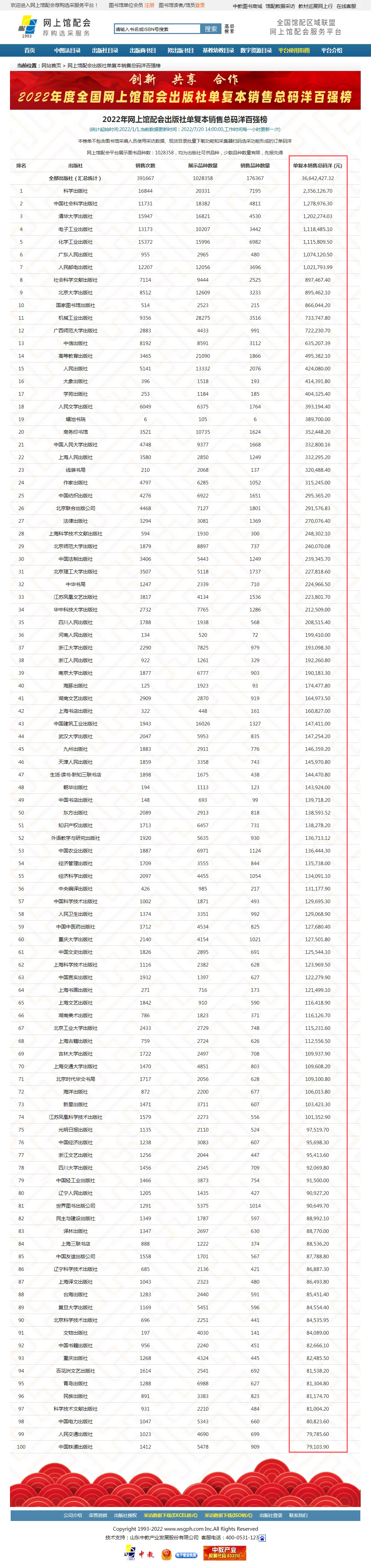 炎炎夏日,驕陽(yáng)似火,“2022年全國(guó)網(wǎng)上館配會(huì)”選采工作進(jìn)入了階段性的高潮!截止到7月20日下午14時(shí):出版社單復(fù)本銷售碼洋達(dá)到了36,642,427.32元!2022全國(guó)網(wǎng)上館配會(huì)自2022年1月1日上線以來,開啟了全年常態(tài)化服務(wù)。參展單位涵蓋了全國(guó)98%以上的主流出版機(jī)構(gòu),包括參會(huì)出版社556家;出版商15家;館配中盤6家。 現(xiàn)將平臺(tái)各類數(shù)據(jù)統(tǒng)計(jì)列表呈現(xiàn)如下: 1.出版社單復(fù)本銷售碼洋百?gòu)?qiáng)榜 【特別提示】1.本榜單是將產(chǎn)品按單副本進(jìn)行統(tǒng)計(jì)2.本榜單不包含圖書館采編人員使用采訪數(shù)據(jù)、現(xiàn)貨目錄批量下載功能和采集器掃碼選采功能形成的訂單碼洋3.網(wǎng)上館配會(huì)平臺(tái)展示圖書品種數(shù)均為出版社可供品種,并實(shí)時(shí)更新。