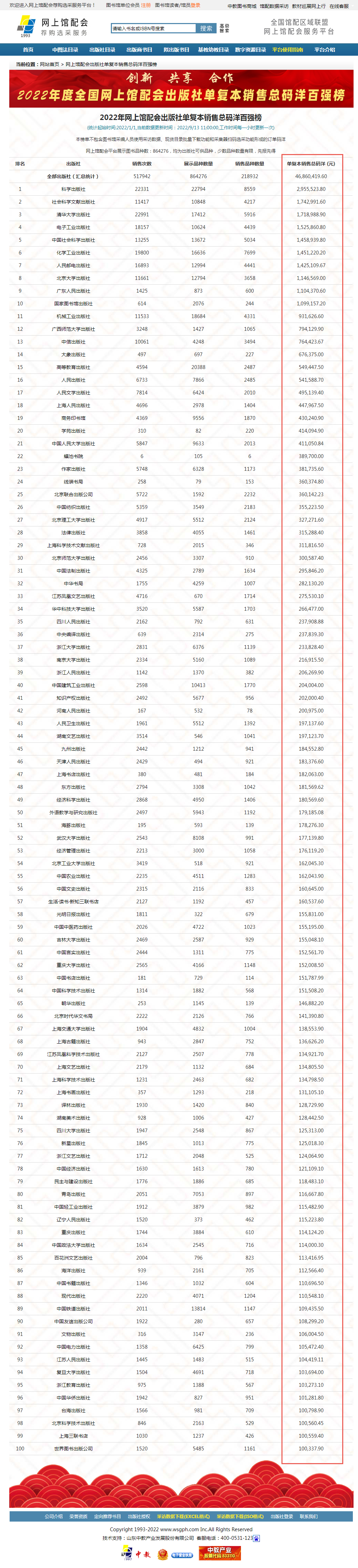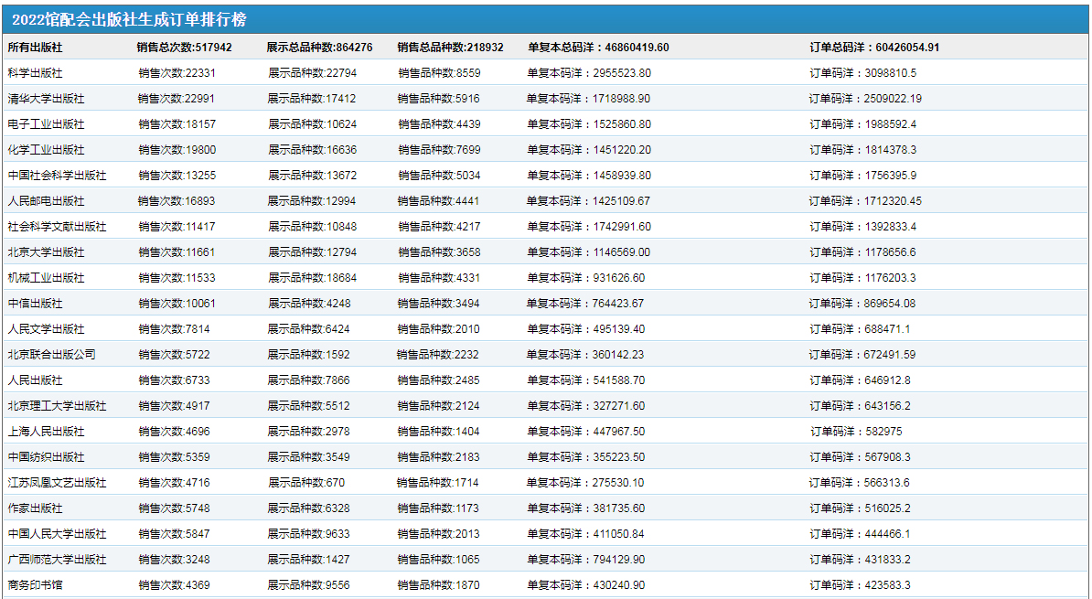 九月中已至,深秋正踏來,“2022年全國網(wǎng)上館配會”選采工作進(jìn)入了階段性的高潮!截止到9月13日上午午11時(shí):出版社單復(fù)本銷售碼洋達(dá)到了46,860,419.60元!2022全國網(wǎng)上館配會自2022年1月1日上線以來,開啟了全年常態(tài)化服務(wù)。參展單位涵蓋了全國98%以上的主流出版機(jī)構(gòu),包括參會出版社556家;出版商15家;館配中盤6家。 現(xiàn)將平臺各類數(shù)據(jù)統(tǒng)計(jì)列表呈現(xiàn)如下: 1.出版社單復(fù)本銷售碼洋百強(qiáng)榜 【特別提示】1.本榜單是將產(chǎn)品按單副本進(jìn)行統(tǒng)計(jì)2.本榜單不包含圖書館采編人員使用采訪數(shù)據(jù)、現(xiàn)貨目錄批量下載功能和采集器掃碼選采功能形成的訂單碼洋3.網(wǎng)上館配會平臺展示圖書品種數(shù)均為出版社可供品種,并實(shí)時(shí)更新。