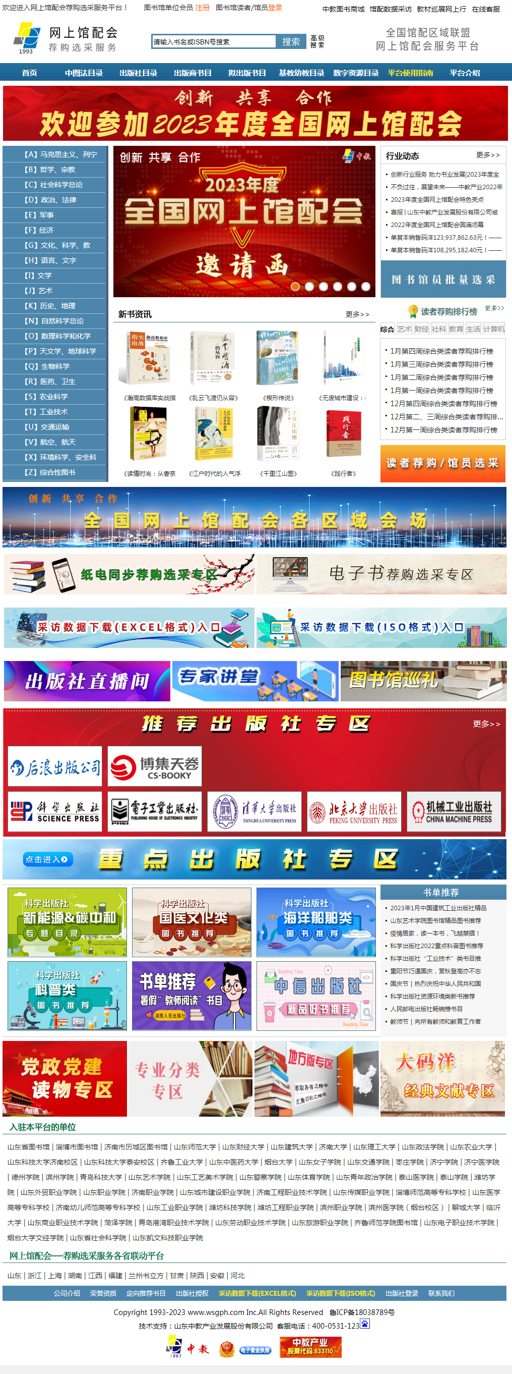 會議時間:2023年2月17日舉行開幕式 指導單位:中國書刊發(fā)行業(yè)協(xié)會科技發(fā)行委員會 中國大學出版社協(xié)會 支持單位:八大社、科技專業(yè)社館配聯(lián)盟、大學出版社館配聯(lián)盟等500多家出版社(商) 主辦單位:全國館配區(qū)域聯(lián)盟各成員單位共同主辦 技術(shù)支持:山東中教產(chǎn)業(yè)發(fā)展股份有限公司 媒體支持:圖書館報 圖書品種:全國500多家出版單位的近百萬條可供書目數(shù)據(jù) 線上網(wǎng)址:www.wsgph.com