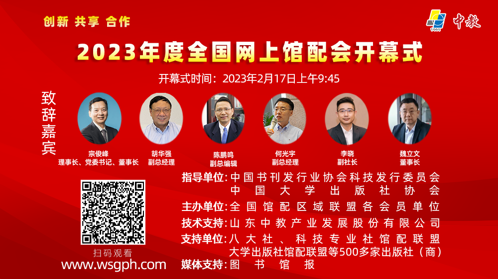 會(huì)議時(shí)間:2023年2月17日舉行開幕式 2023年1月1日--2023年12月31日全年常態(tài)化服務(wù) 指導(dǎo)單位:中國(guó)書刊發(fā)行業(yè)協(xié)會(huì)科技發(fā)行委員會(huì) 中國(guó)大學(xué)出版社協(xié)會(huì) 支持單位:八大社 科技專業(yè)社館配聯(lián)盟 大學(xué)出版社館配聯(lián)盟等500多家出版社(商) 主辦單位:全國(guó)館配區(qū)域聯(lián)盟各成員單位共同主辦 技術(shù)支持:山東中教產(chǎn)業(yè)發(fā)展股份有限公司 媒體支持:圖書館報(bào) 圖書品種:全國(guó)500多家出版單位的近百萬條可供書目數(shù)據(jù) 線上網(wǎng)址:www.wsgph.com