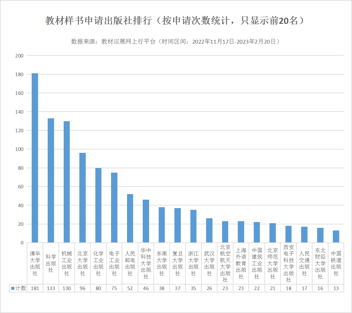 2022年11月17日,“2023全國教材巡展網(wǎng)上行”正式拉開帷幕。 本次活動依托于“教材巡展網(wǎng)上行”(www.jcxzwsx.com)服務(wù)平臺,聯(lián)合科學(xué)出版社、清華大學(xué)出版社、北京大學(xué)出版社、電子工業(yè)出版社、化學(xué)工業(yè)出版社、機械工業(yè)出版社、人民郵電出版社、人民交通出版社、上海外語教育出版社、外語教學(xué)與研究出版社、北京師范大學(xué)出版社、復(fù)旦大學(xué)出版社、國防工業(yè)出版社等169家以教材出版為主的出版社,并得到了學(xué)校教材管理服務(wù)部門的大力支持,打造出一條連接出版社和各學(xué)科任課老師的教材信息交流通道,為各學(xué)科任課老師的教材選用、教材樣書免費申請、自編教材的出版等方面提供優(yōu)質(zhì)的服務(wù)。 “2023全國教材巡展網(wǎng)上行”上線以來,得到了高校教材管理部門及出版社同仁的大力支持及肯定,在此我們深表感謝!為了滿足學(xué)校和出版社的要求,從2022年11月17日開始我們定時播報教材巡展網(wǎng)上行的各類數(shù)據(jù)統(tǒng)計,并保證數(shù)據(jù)的真實性和有效性。 截止到2023年2月20日13時(統(tǒng)計區(qū)間:2022年11月17日0時-2023年2月20日13時) 訪問/展示數(shù)據(jù): 教材巡展網(wǎng)上行平臺頁面訪問數(shù)(PV):100928次 IP訪問數(shù):43848次 參會出版社參展品種:374765種 可贈送教材樣書品種:205011種 目前平臺上參展出版社169家,其中贈送教材樣書的出版社52家(見下圖,均為綜合類出版大社及以教材出版為主的專業(yè)出版社)