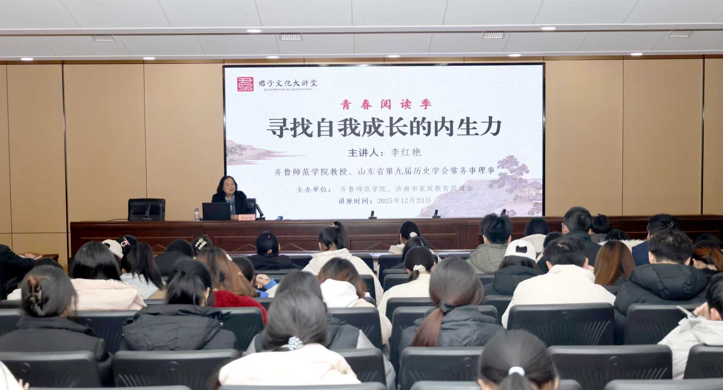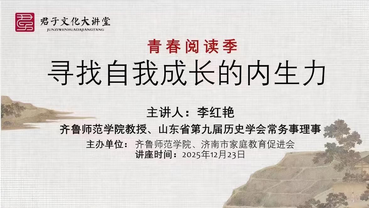 12月23日,“君子文化大講堂・青春閱讀季”之“經(jīng)典閱讀:尋找自我成長的內(nèi)生力”主題講座在齊魯師范學(xué)院成功舉辦。本次講座由齊魯師范學(xué)院、濟(jì)南市家庭教育促進(jìn)會聯(lián)合主辦,山東中教產(chǎn)業(yè)發(fā)展股份有限公司(簡稱“中教產(chǎn)業(yè)”)作為促進(jìn)會發(fā)起單位,深度參與活動籌備與落地,以教育資源賦能經(jīng)典傳播,為廣大師生奉上一場兼具文化厚度與實踐價值的閱讀盛宴。齊魯師范學(xué)院教授、山東省第九屆歷史學(xué)會常務(wù)理事李紅艷受邀擔(dān)任主講人。