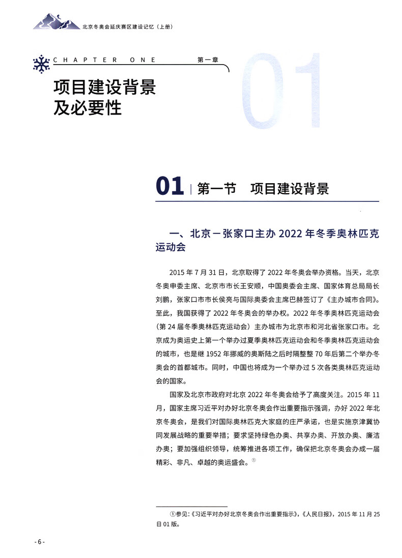 本書共分兩冊, 分別介紹延慶賽區(qū)高山滑雪中心、國家雪車雪橇中心等重點(diǎn)建設(shè)項(xiàng)目和冬奧村、西大莊科村等重點(diǎn)建設(shè)項(xiàng)目。《國家重大工程檔案·冬奧建設(shè)記憶》客觀、系統(tǒng)、立體地記錄冬奧延慶賽區(qū)建設(shè)歷程和成果, 對建立綜合、權(quán)威的工程建設(shè)檔案庫, 宣傳冬奧建設(shè)的重大意義及其成功經(jīng)驗(yàn), 展示建設(shè)者的風(fēng)采具有重要意義。