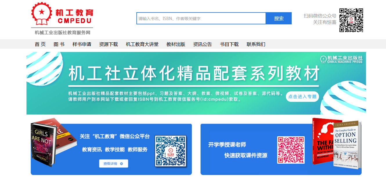機(jī)工教育服務(wù)網(wǎng)(http://www.cmpedu.com)是機(jī)械工業(yè)出版社旗下教育服務(wù)網(wǎng)站,以“傳播新知,服務(wù)教育”為己任,為高校教師提供教材資源下載、樣書申請(qǐng)、樣章試讀、教師培訓(xùn)、選題出版、教育資訊等免費(fèi)服務(wù)。